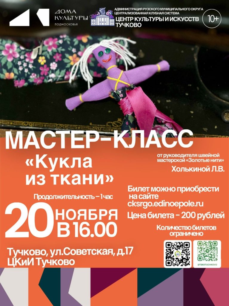 Центр культуры и искусств Тучково приглашает всех желающих на увлекательный мастер-класс «Кукла из ткани». Руководить занятием будет Людмила Холькина, руководитель швейной мастерской «Золотые нити».