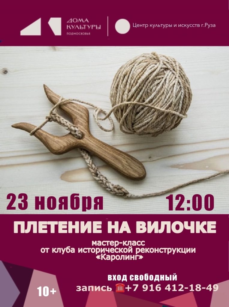 В 12:00 начнётся урок по плетению шнура на вилочке — технике, известной ещё со времён раннего Средневековья. Плетение на вилочке использовалось для создания прочных и красивых шнуров, которые служили украшением одежды или амулетами.