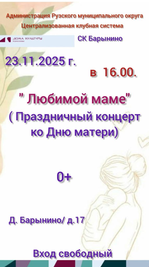 В сельском клубе Барынино 23 ноября в 16:00 состоится праздничный концерт «Любимой маме», посвящённый Дню матери. Этот день — прекрасная возможность выразить благодарность и любовь самым близким людям на земле.