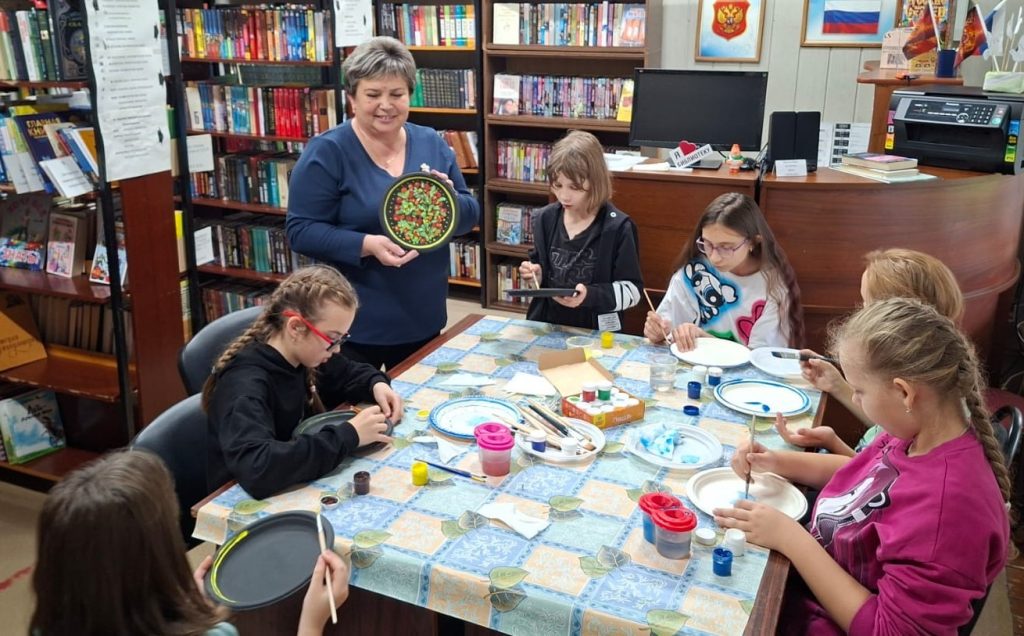 Под чутким руководством библиотекаря участники расписывали тарелки в двух стилях – гжель и хохлома, которые различаются техникой и цветовой гаммой.