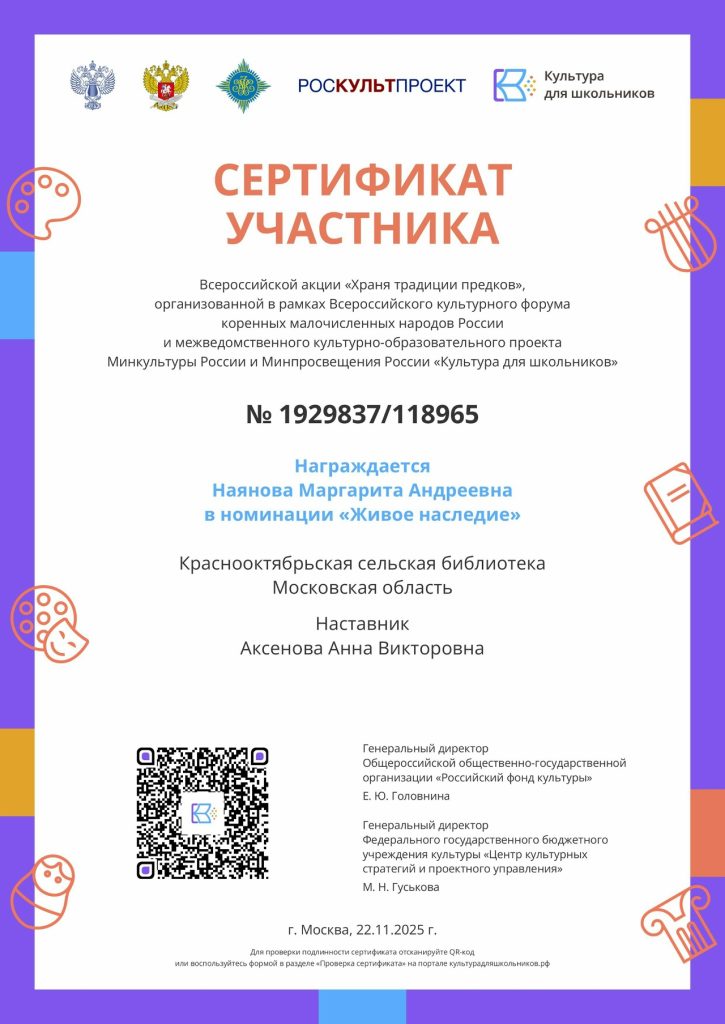 В номинации «Живое наследие» (возрастная категория 6–10 лет) победу одержал Аксёнов Иван. Мы поздравляем его с этим замечательным достижением!