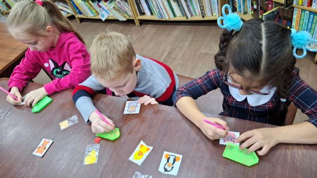 В Дороховской сельской библиотеке Рузского муниципального округа в рамках реализации проекта «Поделись умением своим» прошёл мастер-класс для детей по украшению яркой алмазной мозаикой стикеров на клеевой основе. Это занятие идеально подошло для маленьких ручек, ведь оно развивает моторику, чувство цвета и усидчивость.