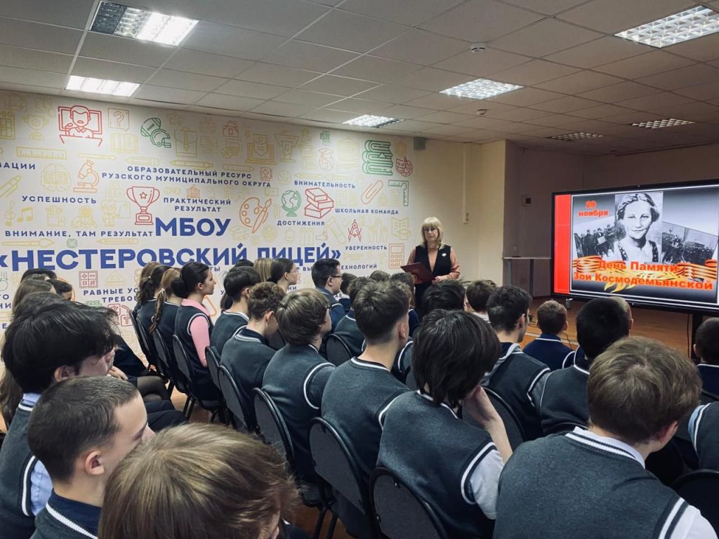 В стенах Нестеровского лицея состоялось патриотическое мероприятие, посвящённое памяти отважной партизанки и первой женщины — Героя Советского Союза Зои Космодемьянской. Встреча прошла в рамках партийного проекта «Успех V единстве поколений» под руководством депутата фракции «Единая Россия» Совета депутатов Рузского муниципального округа Марины Кучариной. Учащиеся лицея познакомились с героической биографией Зои Космодемьянской, узнали о ее самоотверженном подвиге в тылу врага и о том, как юная партизанка проявила невероятную стойкость перед лицом смертельной опасности. Особое впечатление на ребят произвел рассказ о мужестве их сверстницы, которая ценой собственной жизни приближала победу над фашистскими захватчиками. В ходе обсуждения лицеисты делились своими размышлениями о том, что значит быть патриотом в современном мире. Многие учащиеся признались, что судьба Зои Космодемьянской заставила их по-новому осмыслить такие фундаментальные понятия, как долг, честь и мужество.