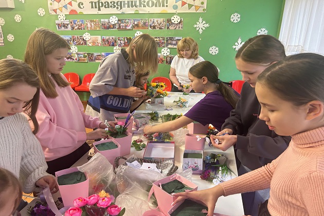 Затем детям предложили сделать подарок для мам своими руками. Под руководством библиотекаря они изготовили праздничный букетик из цветной бумаги и фетра.