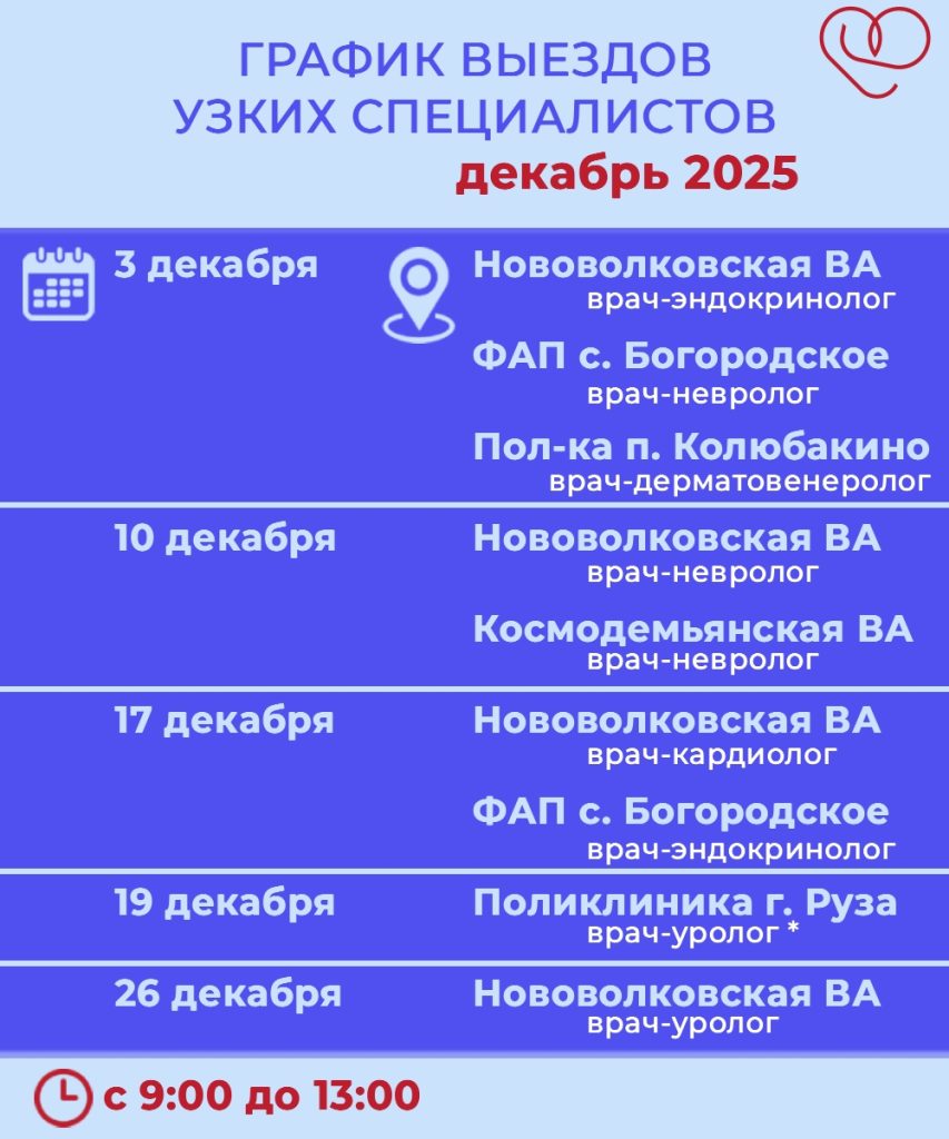 График выездов узких специалистов по подразделениям Рузской больницы на декабрь 2025 года: