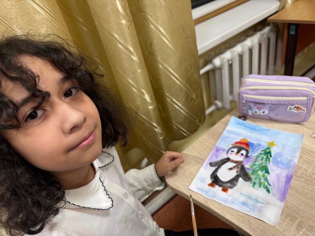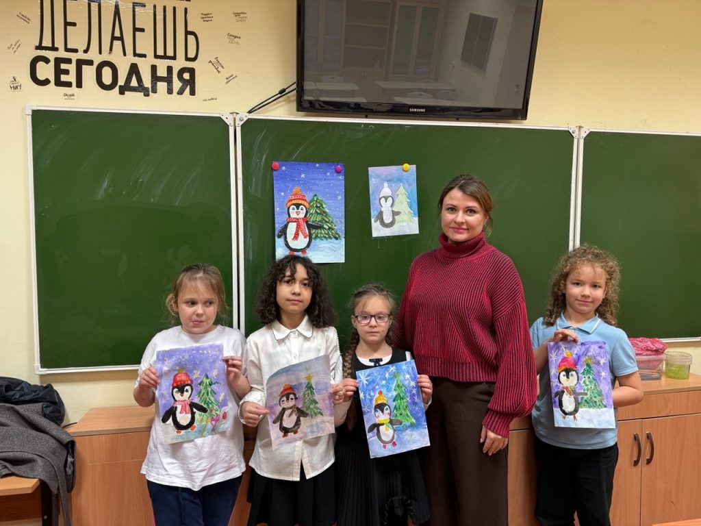 На уроке ребята рисовали забавных пингвинчиков, укутанных в праздничные шарфики, возле нарядных ёлок. Эти рисунки словно приглашают нас в зимнюю сказку. Они наполняют сердце теплом и уютом, ведь за ними стоит детская душа, полная ожидания чуда.