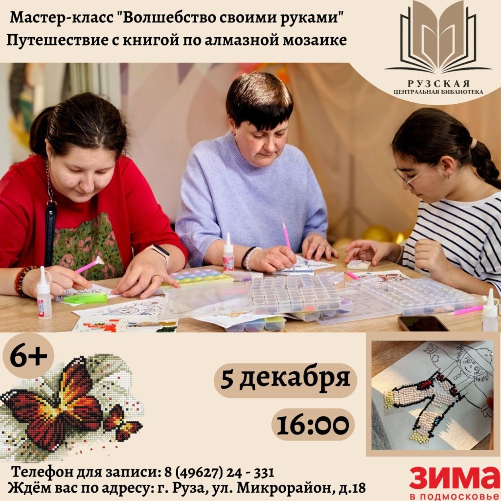 Рузская центральная библиотека приглашает мастер-класс «Волшебство своими руками». 5 декабря в 16:00 ждем вас на увлекательное приключение с книгой и алмазной мозаикой.