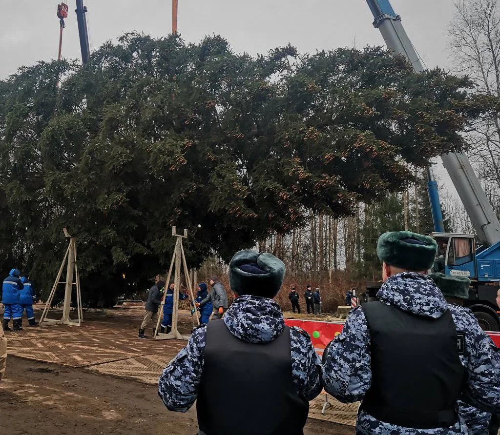 Сотрудники Можайского отдела вневедомственной охраны Главного управления Росгвардии по Московской области обеспечивают сохранность в период подготовки к транспортировке главной новогодней ели страны, которую установят на Соборной площади Кремля.