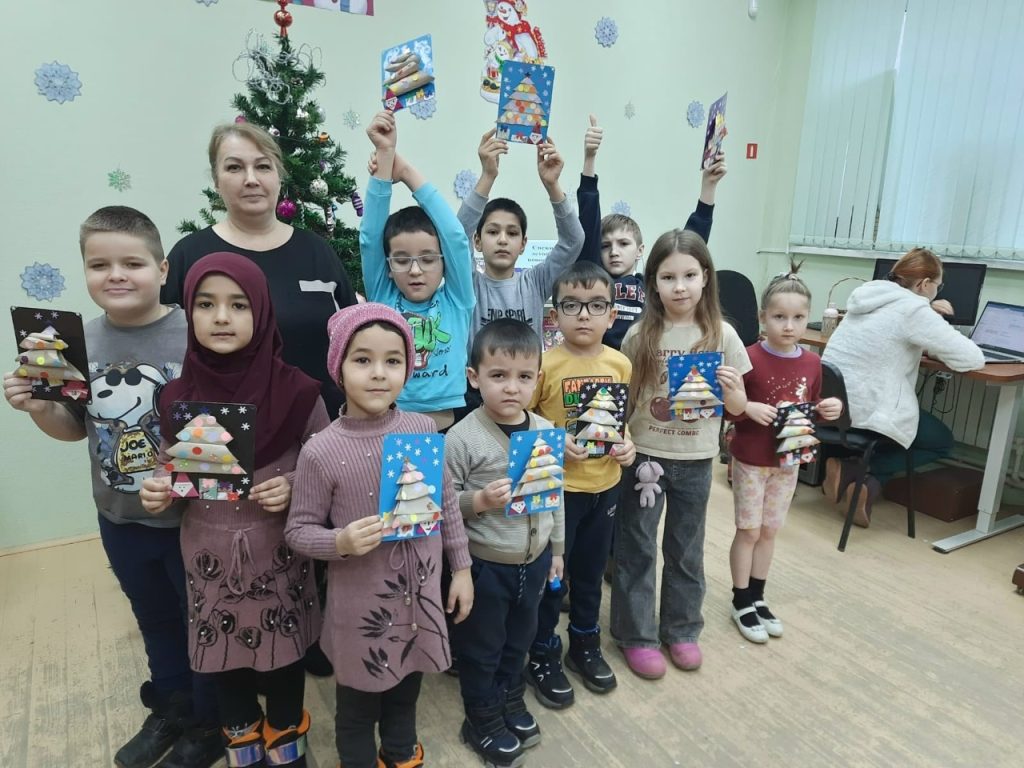 На мастер-классе ребята делали открытку к празднику. Они использовали разные техники: Деда Мороза сделали в технике оригами, а ёлочку — в технике объёмной аппликации. Открытку украсили снежинками.