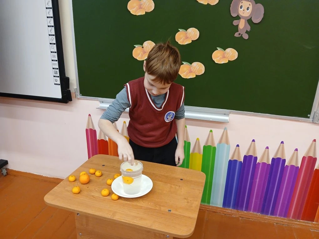 Ребята научились при помощи воды «раскрывать снежинки». Совершили интересное путешествие в страну мандаринов с Чебурашкой. Догадались, как не проливая воды, достать из стакана мандарин. В конце занятия все участники получили от Чебурашки мандарин.