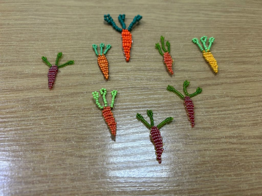 Юные участники изготовили яркие морковки из бисера и проволоки. В ходе работы вспомнили параллельную технику плетения и обсудили полезные свойства моркови.