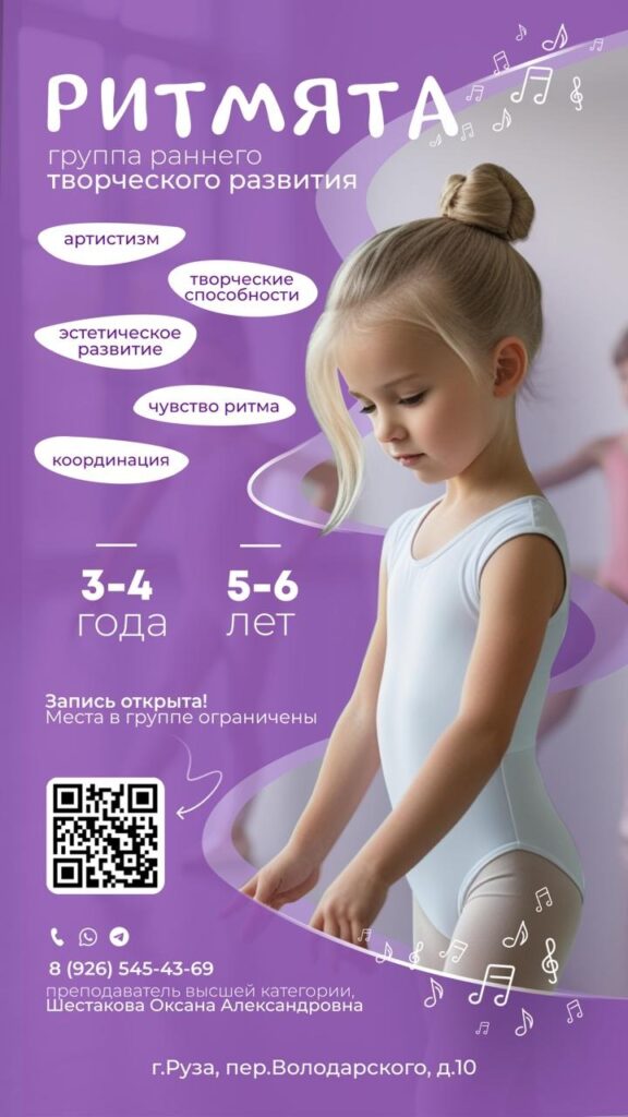 Муниципальное бюджетное учреждение дополнительного образования «Рузская детская школа искусств» приглашает в группу раннего творческого развития «Ритмята». Это уникальная возможность для вашего малыша раскрыть артистизм, творческие способности и эстетическое восприятие. Занятия направлены на развитие чувства ритма, координации движений и общей физической активности.