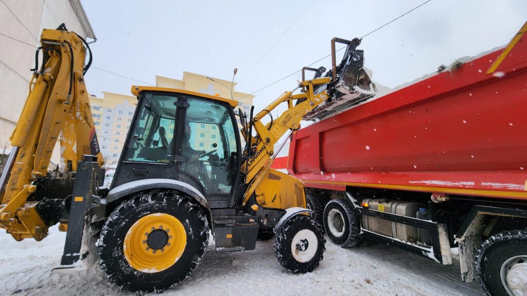Трактор ковшом аккуратно загружает сугробы в самосвал, а сгружают на специально отведённом для этого месте. Коммунальщики работают с особой осторожностью, заботливо пропуская спешащих местных жителей и автомобили.