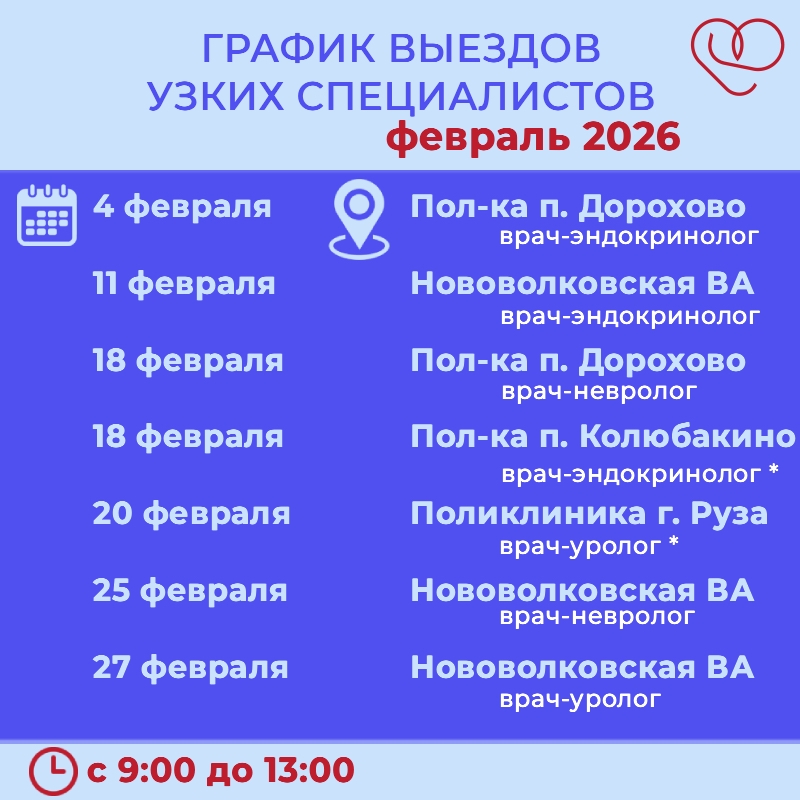 График выездов узких специалистов по подразделениям Рузской больницы на февраль 2026 года: