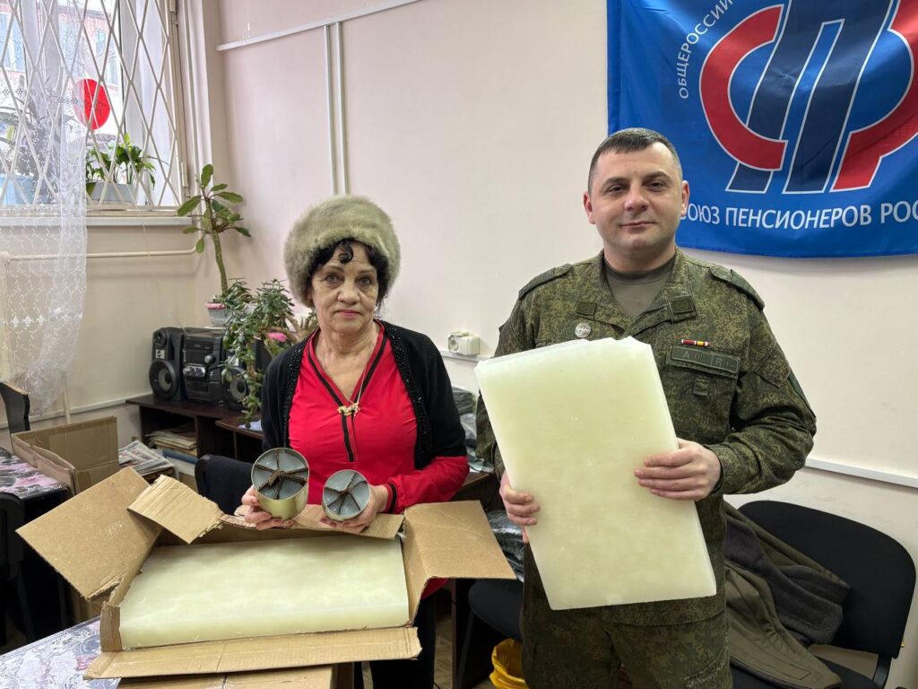 Юрий Алексеевич привёз пенсионерам 30 килограммов парафина, из которого получится более 80 свечей. Они будут отправлены бойцам на передовую.
