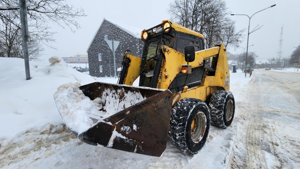 Отметим, что снег оперативно вывозят. Его собирают лаповым погрузчиком и транспортируют на место складирования.