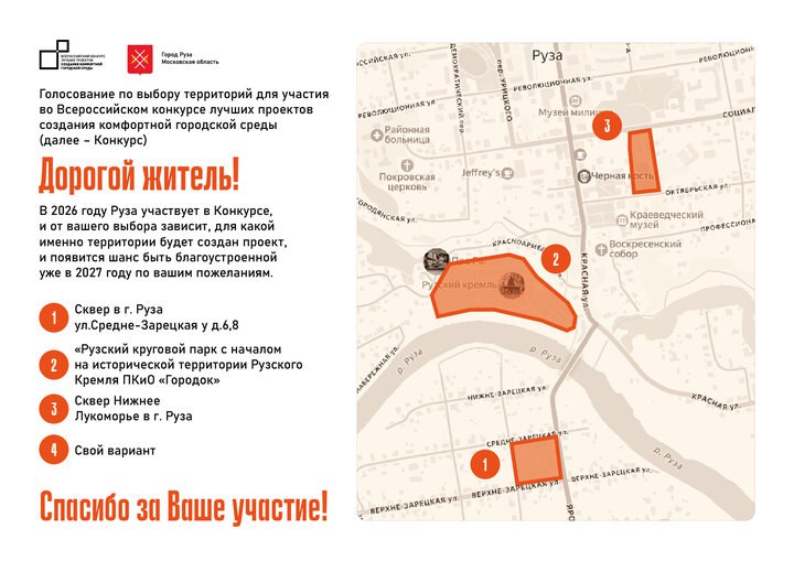 В Рузском муниципальном округе стартовало голосование за объект благоустройства для участия во Всероссийском конкурсе лучших проектов создания комфортной городской среды на 2026 год.