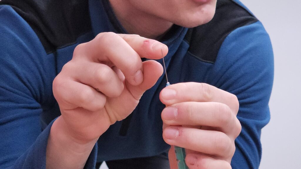 Под руководством инструкторов ребята нарабатывают опыт на специальных тренажёрах, представляющих собой реалистичную часть плоти с искусственной кровеносной системой. Задача юнармейцев — не просто сделать укол, а правильно найти вену и аккуратно ввести условное лекарство или провести забор крови.