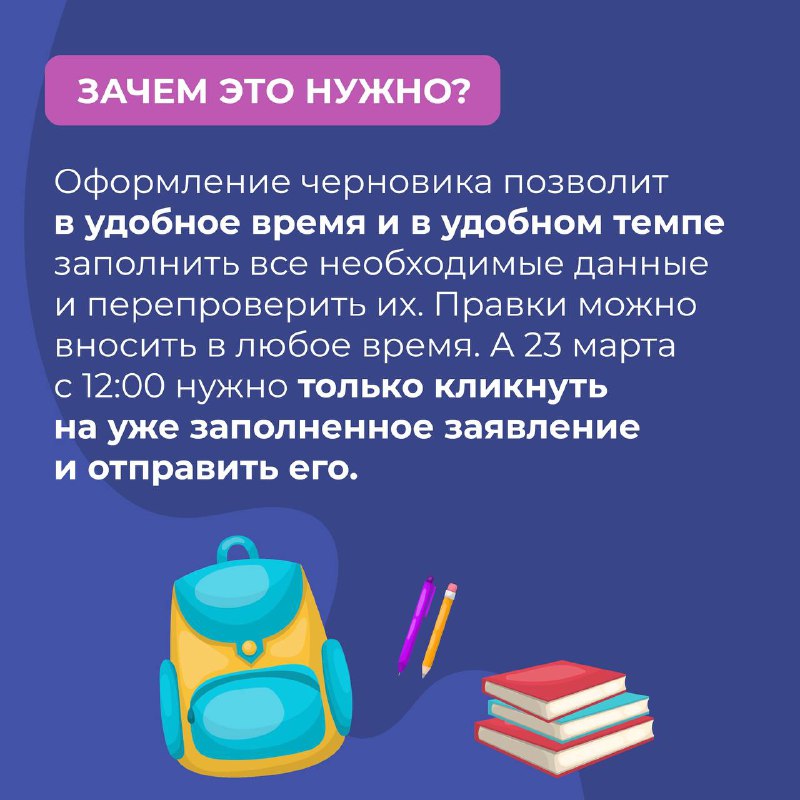 А сама запись в школу в первую волну откроется в этом году раньше – 23 марта в 12:00. Подробно о заполнении черновика можно прочитать в наших карточках.
