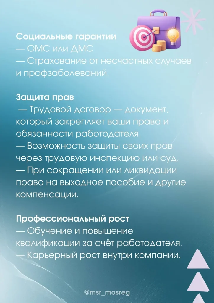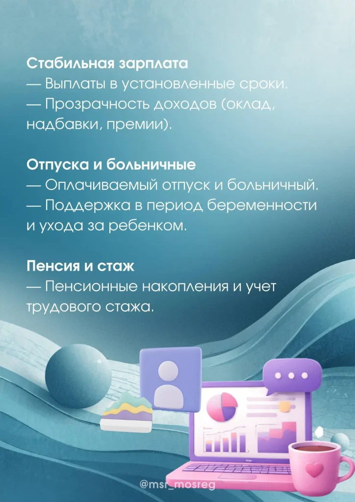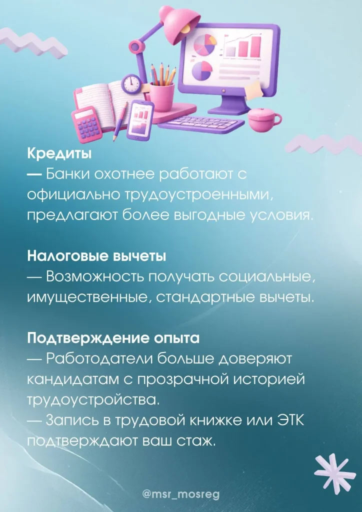 Напоминаем вам о гарантиях и преимуществах официальной работы для сотрудника Опубликовано: 14.04.2026 Комментариев: 0 Просмотров: 77 Официальное трудоустройство — это не просто подпись на документе, а ваш правовой щит в рабочих отношениях. Целый спектр гарантий уже в карточках! По информации Минсоцразвития МО @msr_mosreg